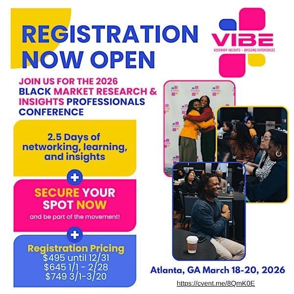 The VIBE Black Market Research & Insights Professionals Conference is a multi-day industry event taking place March 18–20, 2026 in Atlanta. It’s designed for market research professionals, consumer insights strategists, data analysts, brand leaders, and agency decision-makers who want to strengthen their expertise while building meaningful connections within the Black insights community. The conference features thought-provoking sessions, networking experiences, and community-driven conversations centered on innovation and representation in research. Registration is available through Eventbrite with tiered pricing options depending on access level.